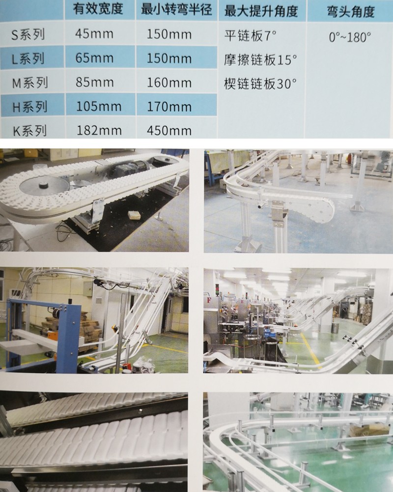 該輸送機使用POM鏈板,表面光滑,摩擦力小,機身有碳鋼和不銹鋼,能滿足各行業(yè)不同需求。便于清潔,-般都可以直接沖洗。設備結構簡單,維護方便。鏈條寬度從82.6mm至304. smm等多種規(guī)格,最小轉彎半徑200mm。